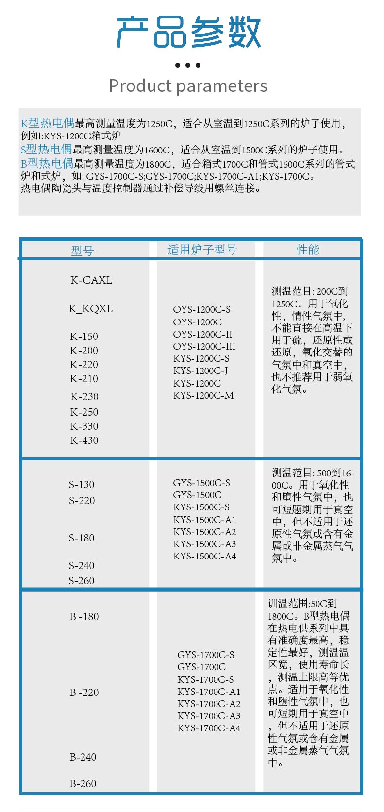 產(chǎn)品概述: K 型熱電偶最高測(cè)量溫度為1250C,適合從室溫到1250C系列的爐子使用,例如: KYS -1200C箱式爐 S 型熱電偶最高測(cè)量溫度為1600C,適合從室溫到1500C系列的爐子使用。 B 型熱電偶最高測(cè)量溫度為1800C,適合箱式1700C和管式1600C系列的管式爐和式爐,如: GYS -1700C- S ; GYS -1700C; KYS -1700C-A1; KYS -1700C。熱電偶陶瓷頭與溫度控制器通過補(bǔ)償導(dǎo)線用螺絲連接。