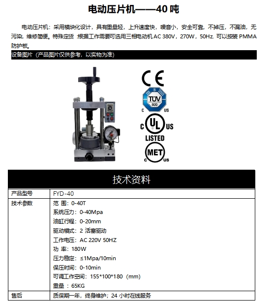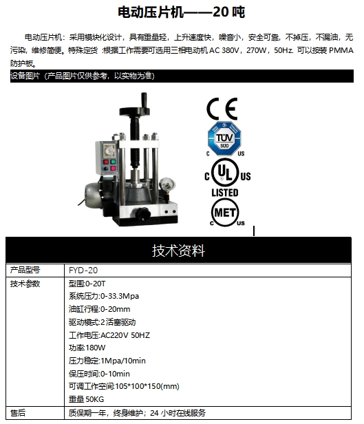 電動(dòng)壓片機(jī):采用模塊化設(shè)計(jì),具有重量輕,上升速度快,噪音小,安全可靠,不掉壓,不漏油,無污染,維修簡便。特殊定貨 :根據(jù)工作需要可選用三相電動(dòng)機(jī)AC 380V,270W,50Hz. 可以按裝PMMA防護(hù)板。